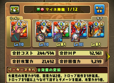 マイネは指上書き後、変換+エンハ+コンボ加算でワンパンが理想。雲暗闇盤面固定操作不可持ってるパーティーなので、毎ターンの大ダメージだけ耐えれるように5個繋ぎを忘れなければ、指のスキル溜めまで耐久可(壊滅級以外)