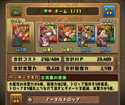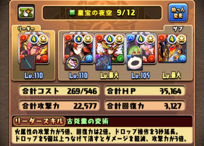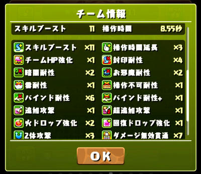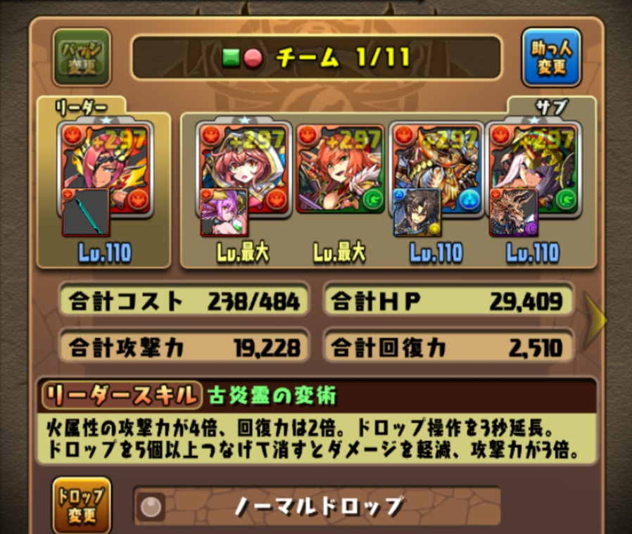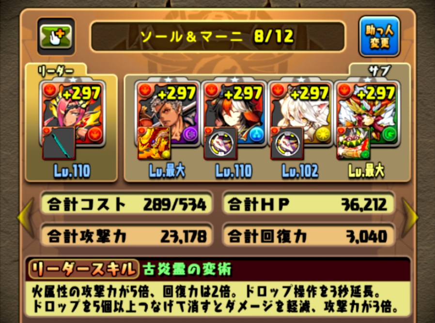 敢えての水に火。火の3個消しなら道中の敵をワンパンせずにターンを稼げる。ボス戦ではエンハが要るので、スキブ多目で。