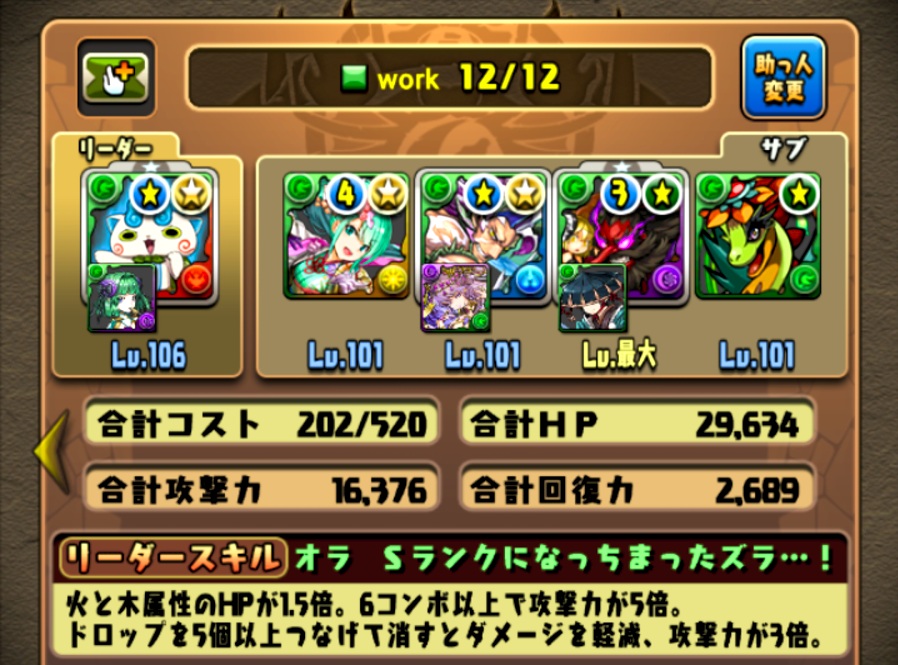 回復が5個以上残ったら、エンハ➡回復1列+木4個消し(正月アルテミスがアタッカーなので)含む全力コンボ(7以上必須)。決まればワンパン出来そう。10コンボくらいでほぼワンパンだった。